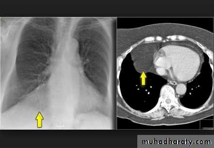 Enhanced CT scan through heart shows a smooth, sharply marginated, low-attenuation mass (arrow) in the right cardiophrenic angle, consistent with a pericardial cyst.Neurofibroma.