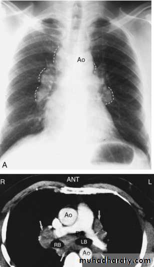 Marked lymphadenopathy (dotted lines) is seen in the region of both hila in the right paratracheal region (A).The transverse contrast-enhanced computed tomography scan of the upper chest (B) clearly shows the ascending and descending aorta (Ao) as well as the pulmonary artery (PA) and superior vena cava. The right and left main-stem bronchus area also is seen. Arrows, the extensive lymphadenopathy.