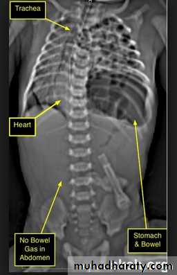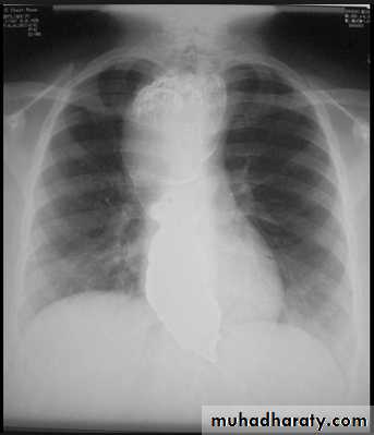 A barium swallow study demonstrates a large hiatal hernia with the majority of the stomach in the chest, not in the abdomen where it belongs.