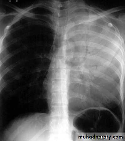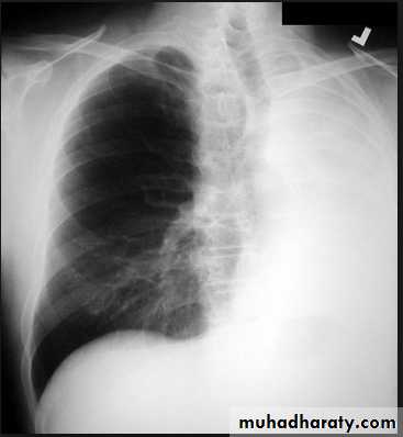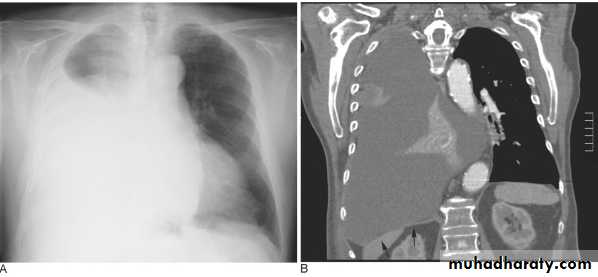 On a posteroanterior chest x-ray (A), the left hemithorax is very dark or lucent because the left lung has collapsed completely (white arrows).The tension pneumothorax can be identified because the mediastinal contents, including the heart, are shifted toward the right, and the left hemidiaphragm is flattened and depressed. A computed tomography scan done on a different patient with a tension pneumothorax (B) shows a completely collapsed right lung (arrows) and shift of the mediastinal contents to the left.