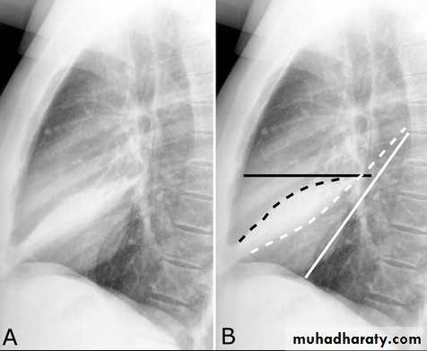 Posteroanterior (A) and lateral (B) chest radiographs demonstrate the typical meniscoid appearance (arrows) in a patient with a left pleural effusionHydropneumothorax.
