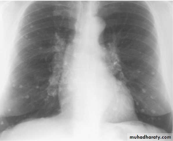 a frontal radiograph demonstrates innumerable micronodular opacities characteristic of micronodular (miliary) interstitial disease. Transbronchial biopsy demonstrated caseating granulomas containing acid-fast bacilli.Tuberculoma