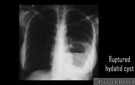 Un complicated Hydatid cyst of th lung , cuased by echenococus granulosis seen as well defined nodule or mass lesion .