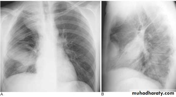 (A) PA and (B) lateral chest radiographs. Pleural fluid is encapsulated in the major fissure and against the anterior chest wall. These encysted fluid collections can mimic a lung tumour.Empyema.