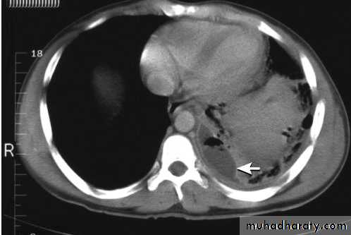 A computed tomography scan shows a posterior left pleural fluid collection (arrow) containing air (dark) and surrounded by thickened pleura.