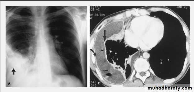 A. Posteroanterior chest film in a patient with a recent right lower pneumonia demonstrates an oval opacity in the right lateral costophrenic sulcus containing gas (arrow).B. An enhanced CT scan shows a circumferential pleural fluid collection with enhancing visceral (straight arrow) and parietal (curved arrow) pleural layers representing an empyema.