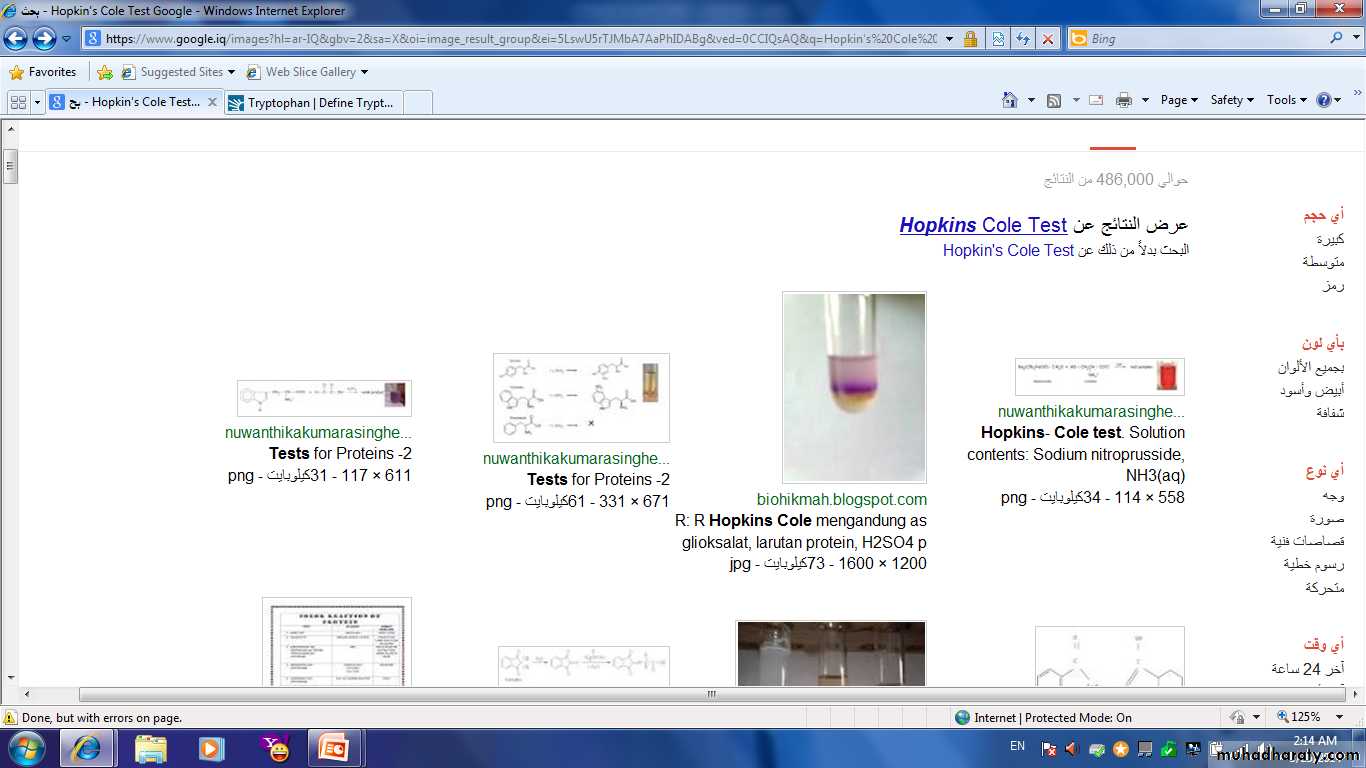 • Hopkin's Cole is a specific test for tryptophan, the only amino acid containing an indole group. results in the formation of purple ring when a solution containing a mixture of Hopkin's cole reagent layered over concentrated sulfuric acid.Structural formula of indole