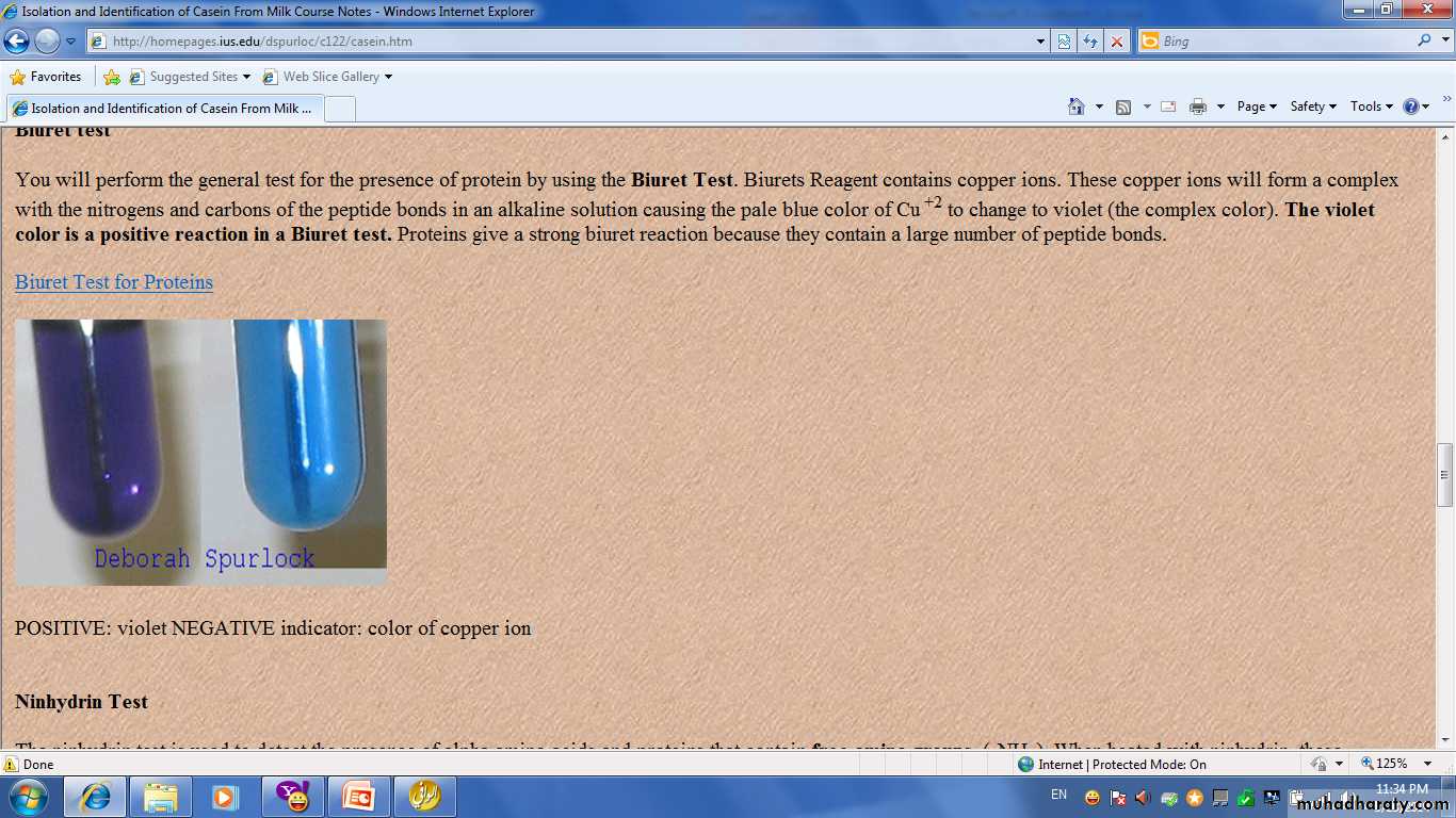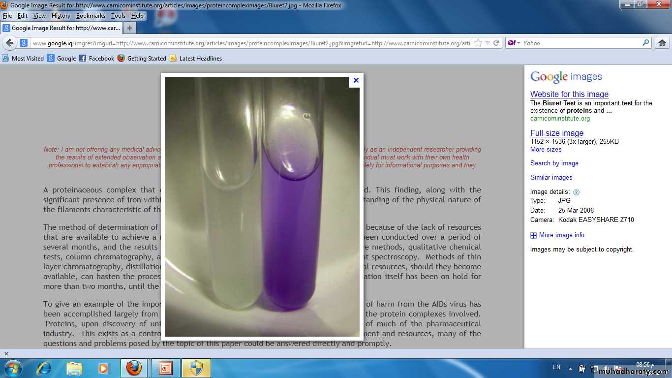 Is commonly used to detect the presence of proteins and peptiedes by treating a sample with an alkaline solution of dilute copper sulfate to yield a pink-violet to purple-violet colour. At least two peptide bonds (tripeptide) are required for positive test Biuret. The intensity of the colour complex produced is directly proportional to the number peptied bond present.