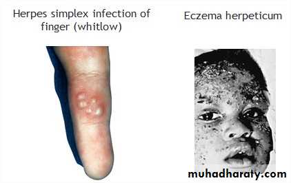 Eczema herpeticum: cutaneous HSV infections can be severe or life-threatening in patients with disorders of the skin such as eczema.