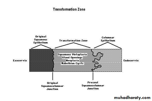 The transformation zone is a dynamic area, usually located on the ectocervix. At times, the distal edge of the transformation zone extends into the upper vagina. The transformation zone, by definition, is the area between the original squamocolumnar junction and the current squamocolumnar junction. The transformation zone is that portion of the cervix that originally was columnar epithelium and through a process of squamous metaplasia is now squamous epithelium. Squamous metaplasia occurs continuously; however, this process is most active during fetal development, around the time of menarche, and during pregnancy. Local hormonal changes, as reflected by vaginal pH, influence this process.It consists of endocervical stroma and glands covered by squamous epithelium.