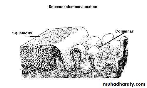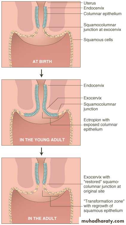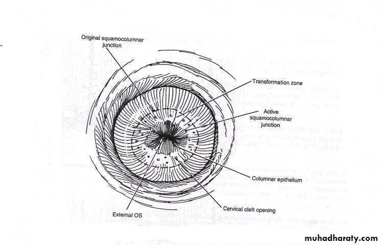 The location of squamocolumnar junction in relation to the external os varies depending upon age, menstrual status, and other factors such as pregnancy and oral contraceptive use. The epithelium of the transformation zone is identified by the variegation of the color between the two native epithelia.The anatomical site of the squamo-columnar junction fluctuates under hormonal influence through out the reproductive life.