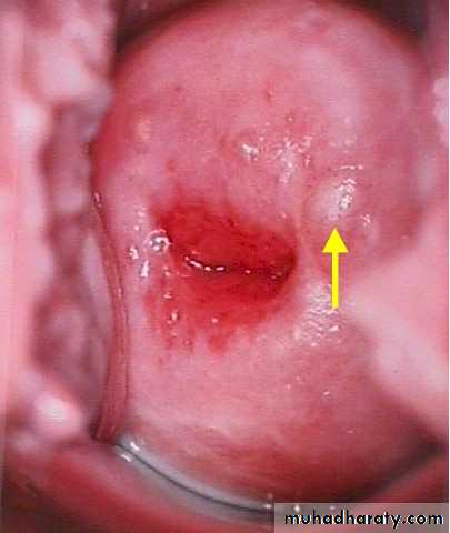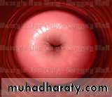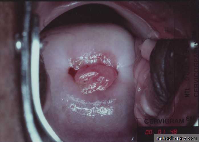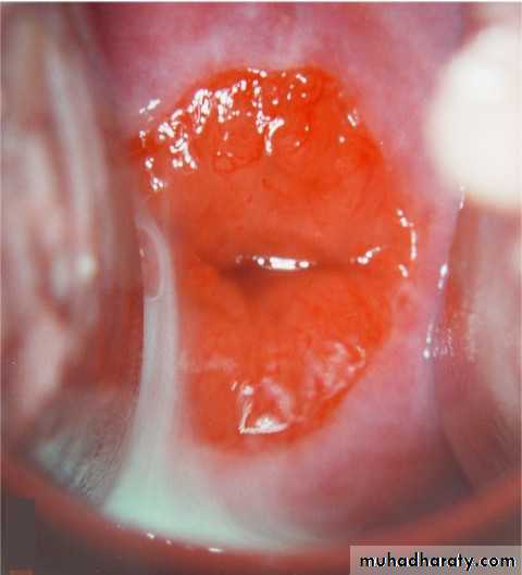 Speculum examination:*Bright red area is seen around the external os continuous with the endocervix with clearly defined outer edge. The eversion of the columnar epithelium is more pronounced on the anterior and posterior lips of the ectocervix and less on the lateral lips.