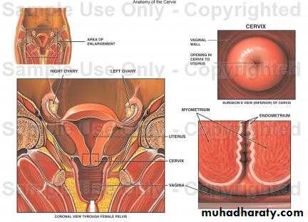 The cervix is fibromuscular inferior part of the uterus protruding into the vagina. It measures 2.5-3 cm in diameter and 3-5 cm in length. The normal anatomic position of the cervix is angulated slightly downward and backward.The external os is usually small and round in nulliparous women but can be seen as a transverse slit in those who have had cervical dilation during labor. The anterior and posterior fornices limit the portio (exocervix). The cervical canal measures approximately 8 mm wide and contains longitudinal ridges. The opening of the cervical canal into the uterus is called the internal cervical os. The area between the endocervical and endometrial cavity is called the isthmus or lower uterine segment.