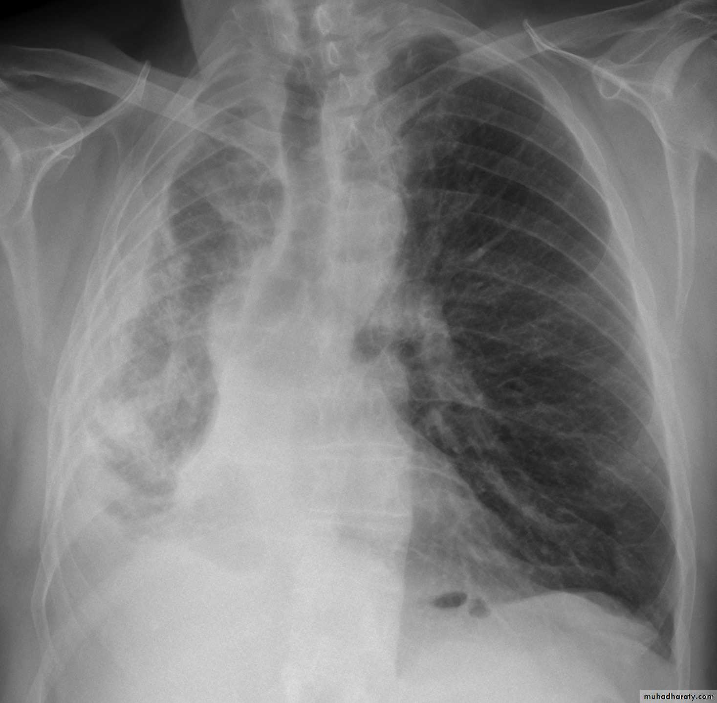 • CXR: lung surrounded by thick irregular pleura with multiple nodules with extension to nearby structures.