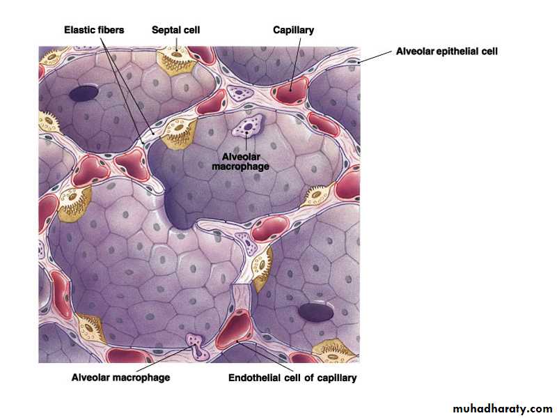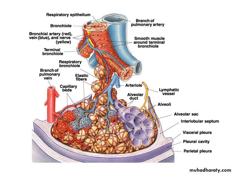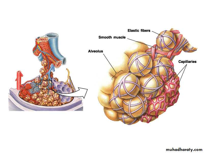 The normal adult human lung weighs about 1000g and consists of about 50% blood and 50% tissue by weight. About 10% of the total lung volume is composed of various types of conducting airways and some connective tissue. The remaining 90% is the respiratory or gas exchange portion of the lung, composed of alveoli and supporting capillaries.