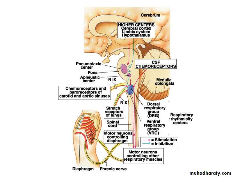 Center receives stimulation from receptors and simulation from parts of brain concerned with voluntary respiratory movements and emotion