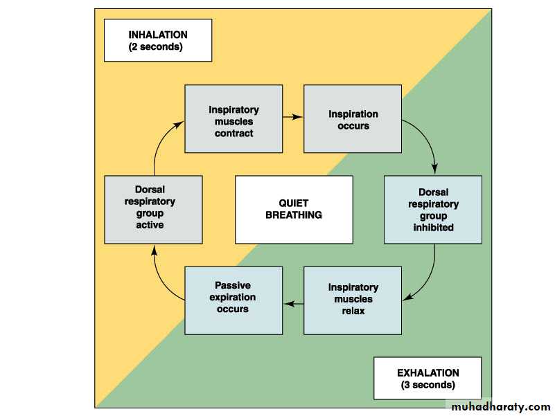 Neurons stimulating also responsible for stopping inspiration and receive input from pontine group and stretch receptors in lungs. Inhibitory neurons activated and relaxation of respiratory muscles results in expiration.