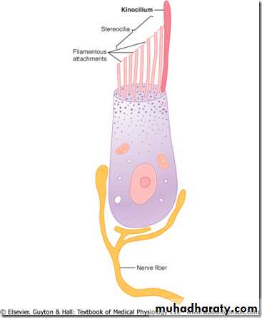-when stereocilia bend towards kinocilium –> stimulation -when sterocilia bend away from kinocilium –> inhibition