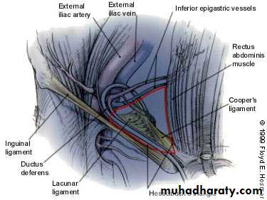 Inguinal ligament (base), rectus (medial), inferior epigastric vessels (lateral)