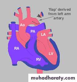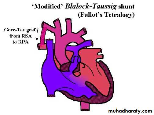 Palliative surgeryModified Blalock – Taussing shunt , which a conduit from subclavian artery to homolateral branch of pulmonary art. or directly from ascending art. To main pulmonary artery .