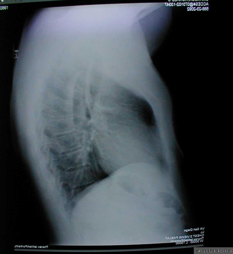Pectus excavatum: Congenital posterior displacement of lower aspect of sternum. This gives the chest a somewhat "hollowed-out" appearance. The x-ray shows a subtle concave appearance of the lower sternum.