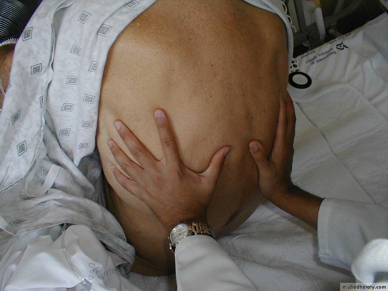 The chest normally expands symmetrically. Asymmetric expansion suggests unilateral volume loss, as in atelectasis or pleural effusion, unilateral airway obstruction, asymmetric pulmonary or pleural fibrosis, or splinting from chest pain.