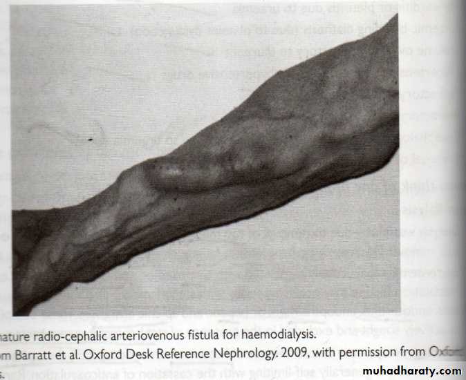 3. AV fistula (mainly forearm): Palpable thrill, Bruit (by Stethoscope Bell), and fresh needle marks (indicates the fistula is in use); Figure 3.