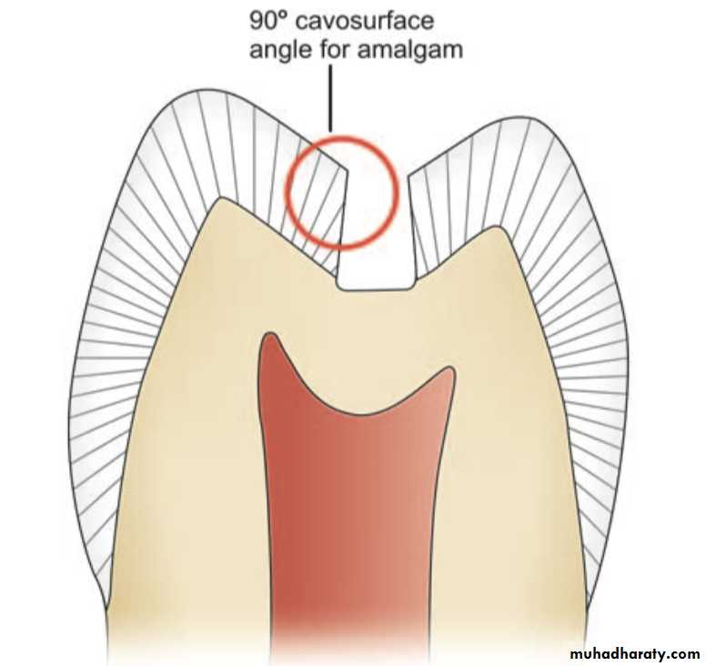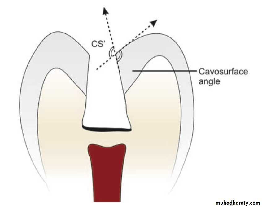 Cavosurface angle is formed by the junction of a prepared tooth surface wall and external surface of the toothThe acute junction is referred to as preparation margin or cavosurface margin. The cavosurface angle may differ with the location of tooth and enamel rod direction of the prepared walls and also differ according to the type of restorative material to be used