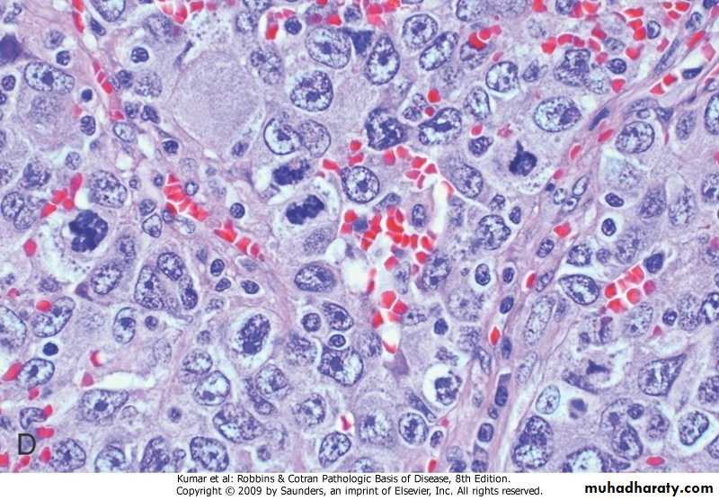 5,Large cell carcinoma: Undifferentiated carcinoma consist of large hyperchromatic cells with some giant malignant cells.It is probably of squamous or adeno carcinoma that is so undifferentiated to know the histogenesis