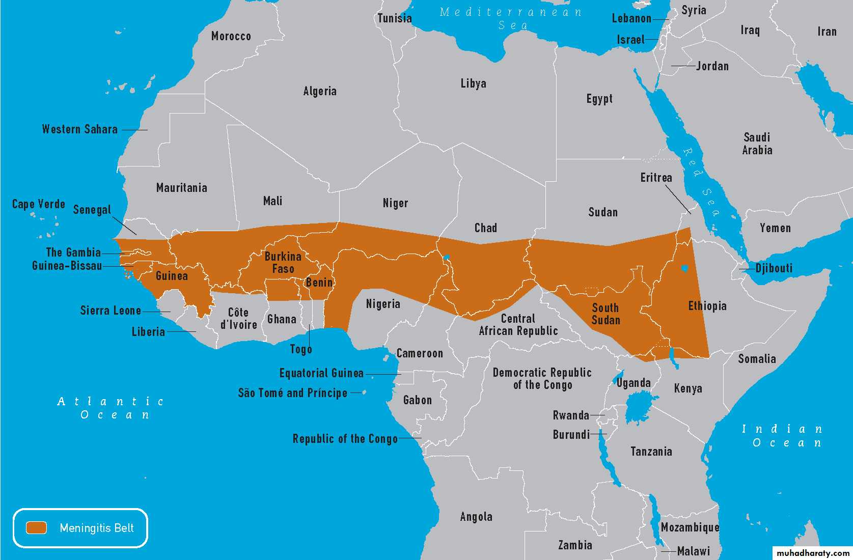 In Sub-Saharan Africa (African meningitis belt) the disease classically peaks during the dry season