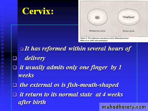 In first few days, the cervix can readily admit two fingers , but by the end of the second weeks the internal os should be closed. However, the external os can remain open permanently , giving characteristic appearance to the parous cervix.In the first few days , the stretched vagina is smooth & oedematous , but by the third week rugae begin to reappear