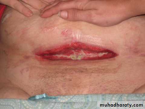 is the result of secondary infection . The wound should be irrigated twice daily & healing should be allowed by secondary intention .Sometimes secondary suturing may be required.