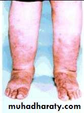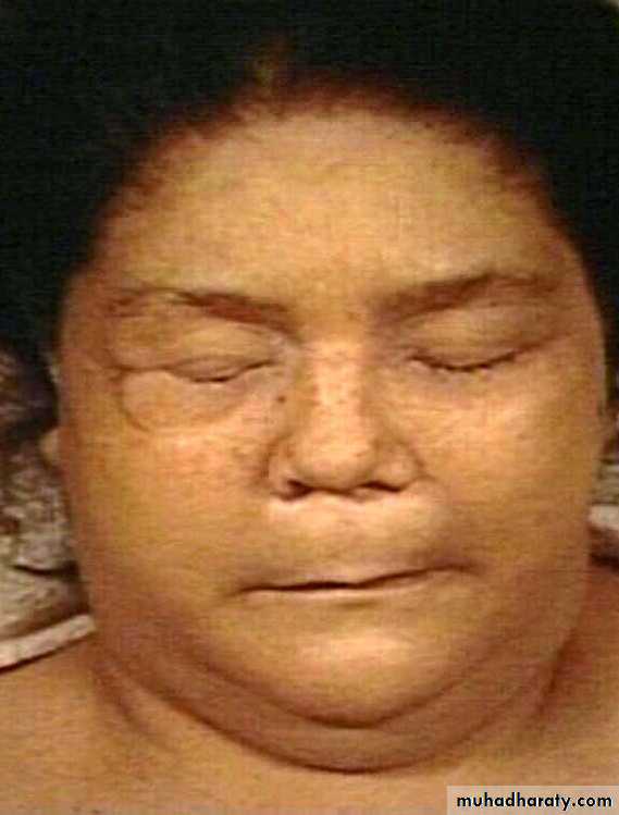 Infiltration of the dermis gives rise to non pitting oedema (myxedema), which is most marked in the skin of the hands, feet, face and eyelids.