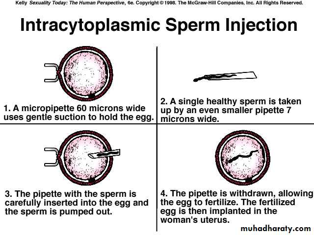 •Intracytoplasmic Sperm injection (ICSI) A single spermatozoon is injected directly into the oocyte cytoplasm (through the intact zona pellucida). Pregnancy rates are 15–22% per cycle.
