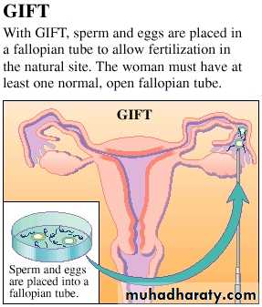 •Gamete intrafallopian transfer (GIFT) Oocytes and sperm are mixed and deposited into the fallopian tubes via laparoscopy. Variations include zygote intrafallopian transfer (ZIFT) and tubal embryo transfer (TET).
