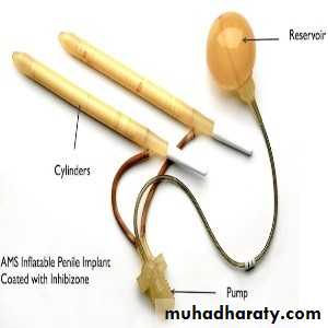 semi-rigid, malleable, and inflatable penile prostheses are available for surgical implantation into the corpora to provide penile rigidity and sufficient erectile size for sexual intercourse. Side-effects: mechanical failure; erosions; infections.