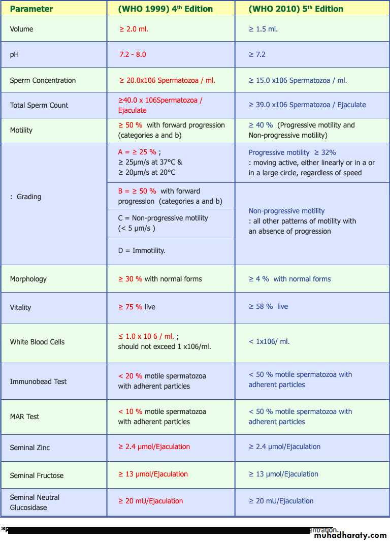 Basic investigationsSemen analysis 2 or 3 specimens over several weeks, collected after 3-7 days of sexual abstinence. Deliver specimens to the laboratory within 1h. Ejaculate volume, liquefaction time, and pH are noted . Microscopy techniques measure sperm concentration, total numbers, morphology, and motility. The mixed agglutination reaction (MAR test) is used to detect antisperm antibodies. The presence of leucocytes (>1 أ— 106/ml of semen) suggests infection, and cultures should be requested.
