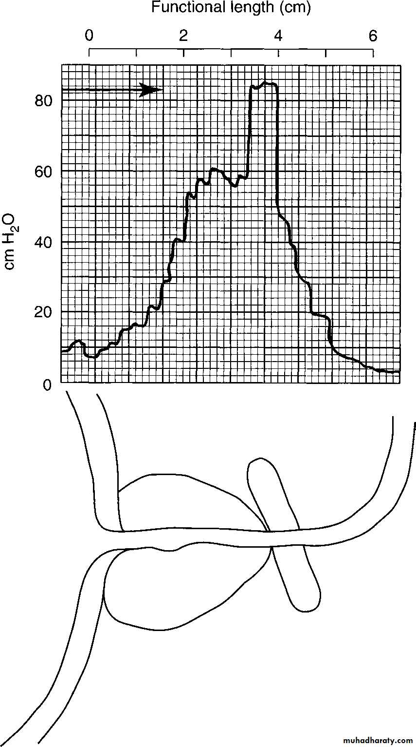with water and recording the intravesical pressure against the volume of water introduced into the bladder.