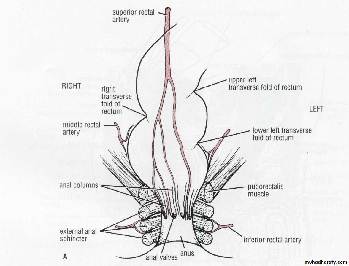 1-The superior rectal artery arises from the terminal branch of the inferior mesenteric artery and supplies the upper rectum.