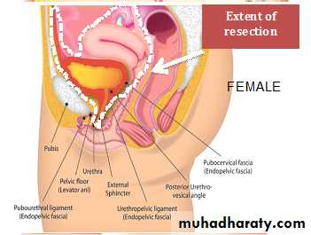 Includes removal of :In Male : Bladder ( &its surrounding fat and peritoneal attachment) Prostate Seminal Vesicles
