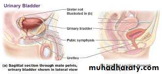 In males, the seminal vesicles, vas deferens, ureters, and rectum border the inferoposterior aspect of the bladder. Anteriorly there is space filled with fibroadipose tissue and the prevesical fascia. The dome and posterior surface of the bladder are covered by parietal peritoneum, which reflects superiorly to the seminal vesicles and is continuous with the anterior rectal peritoneum.