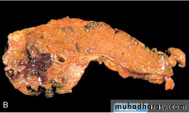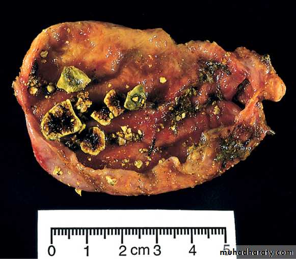 This may be acute, chronic, or acute superimposed on chronic, and almost always occurs in association with gallstones.Gross features