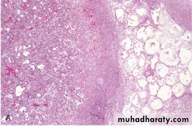 Due to early development of obstructive jaundice, these tumors are detected as small firm, gray nodules within the bile duct wall. Alternatively, they are diffusely infiltrative lesions that create thickening of the wall.These adenocarcinomas are generally well-differentiated with an abundant fibrous stroma