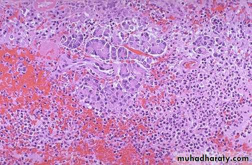 At high magnification, acute inflammation with necrosis and hemorrhage is seen with residual pancreatic acini in a case of acute hemorrhagic pancreatitis.