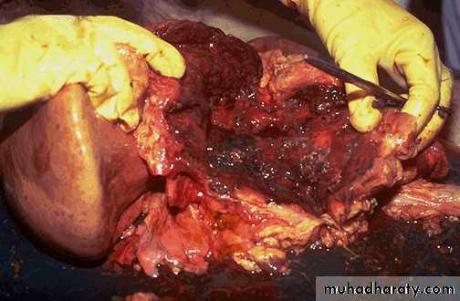 In the most severe forms there is extensive parenchymal necrosis accompanied by diffuse hemorrhage.