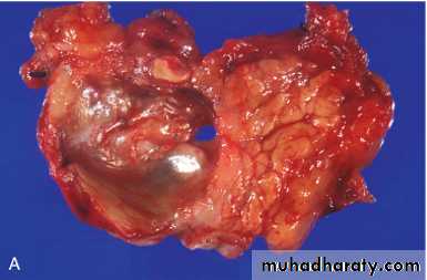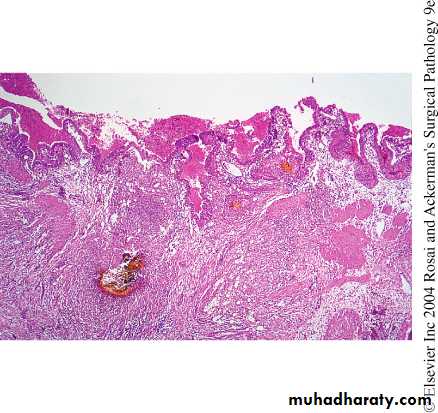 Well- to poorly-differentiated infiltrative adenocarcinomas that is sometimes papillary.By the time gallbladder cancers are discovered, most have invaded the liver directly and many have extended to the cystic duct and adjacent bile ducts and lymph nodes at the portahepatis.