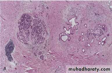 A, Massive neoplasm in the right lobe and multiple metastases throughout the liver. B, Tumor cells forming glandular structures surrounded by dense sclerotic stroma.• THE EXOCRINE PANCREAS