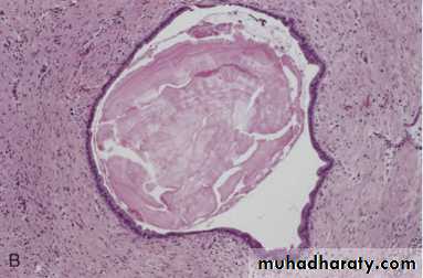 A, Cross-section revealing a poorly defined cyst with a necrotic wall. B, Histologically the cyst lacks a true epithelial lining and instead is lined by fibrin, granulation tissue, and chronic inflammation.