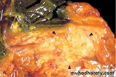In milder forms there is edema & congestion of the organ with foci of fat necrosis.Fat necrosis results from enzymatic destruction of fat cells; the released fatty acids combine with calcium to form insoluble salts that precipitate locally and appear as yellow-white chalky deposits within & outside the pancreas e.g. in the omentum and mesentery.