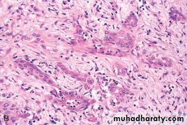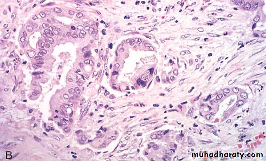 A, A cross-section through the head of the pancreas and adjacent common bile duct showing both an ill-defined mass in the pancreatic substance (arrowheads) and the green discoloration of the duct resulting from total obstruction of bile flow. B, Poorly formed glands are present in a densely fibrotic (desmoplastic) stroma within the pancreatic substance.